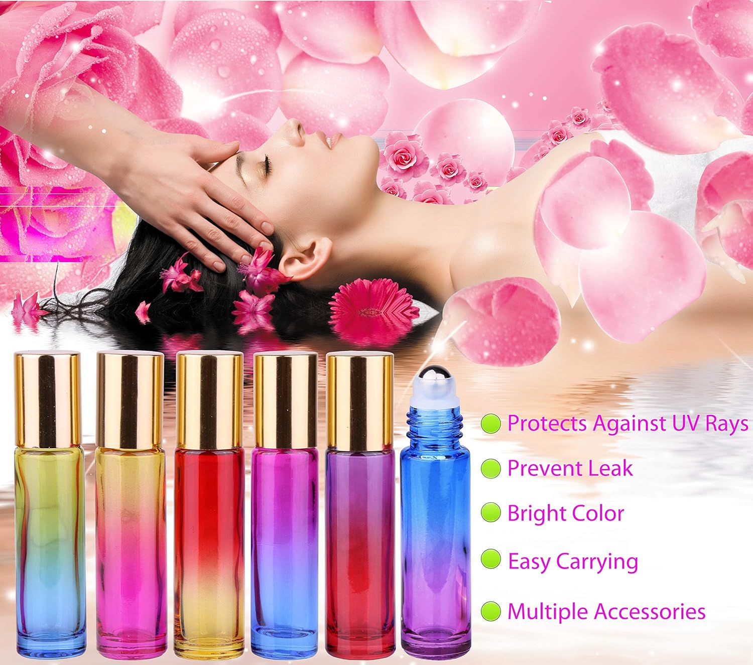 - Package includes: 4 gradient color glass bottles(4 diferent colors) +4 roller balls +6 labels +2 droppers +2 funnel +1 opener