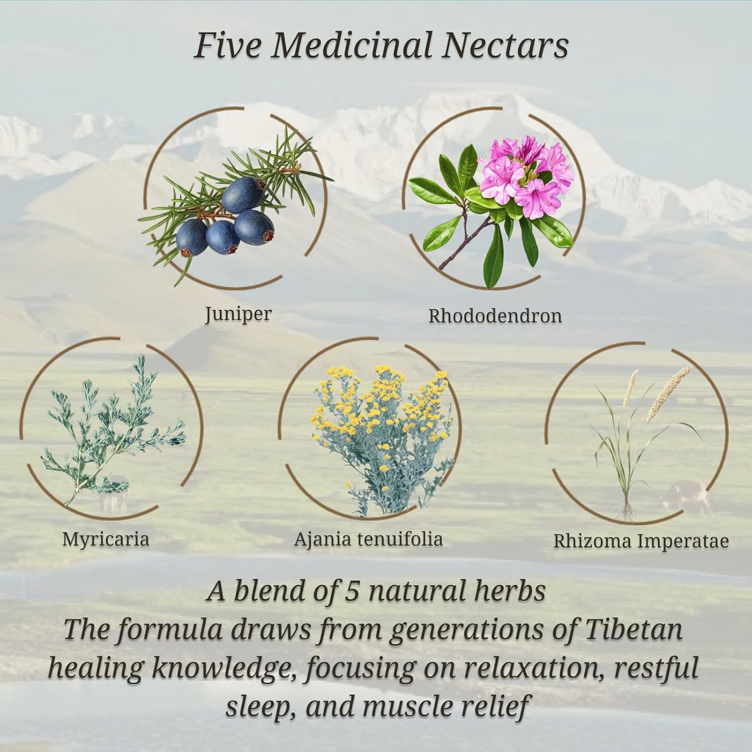- Natural Ingredients: Made with Tibetan natural botanicals and premium ingredients. The formula is called "The Five Medicinal Nectars". It draws from generations of Tibetan healing knowledge, focusing on relaxation, restful sleep, and muscle relief.
