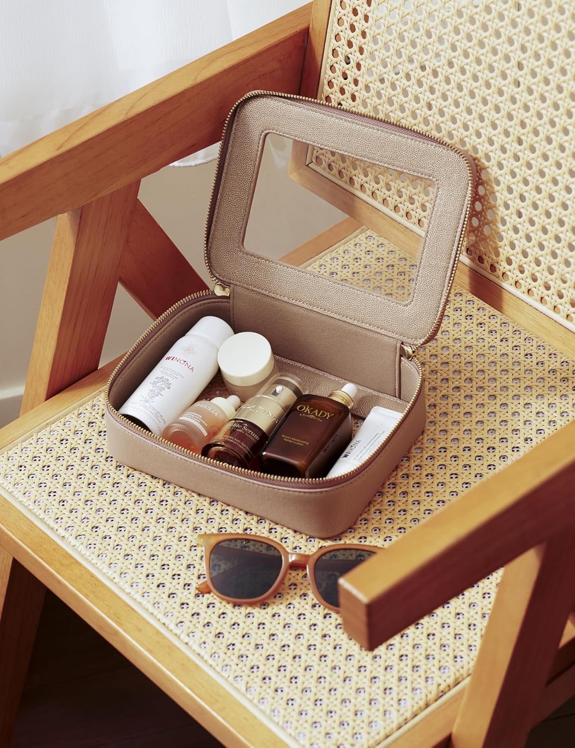 - [Compact and Portable] – The gold travel make up bag measures 8.3'' x 6.1'' x 2.4'' (21cm x 15.5cm x 6cm), designed to offer a compact and travel-friendly solution for organizing your makeup and toiletry essentials. It can be easily fit into a variety of bags, whether you prefer to carry it in a handbag, tote, or travel luggage.