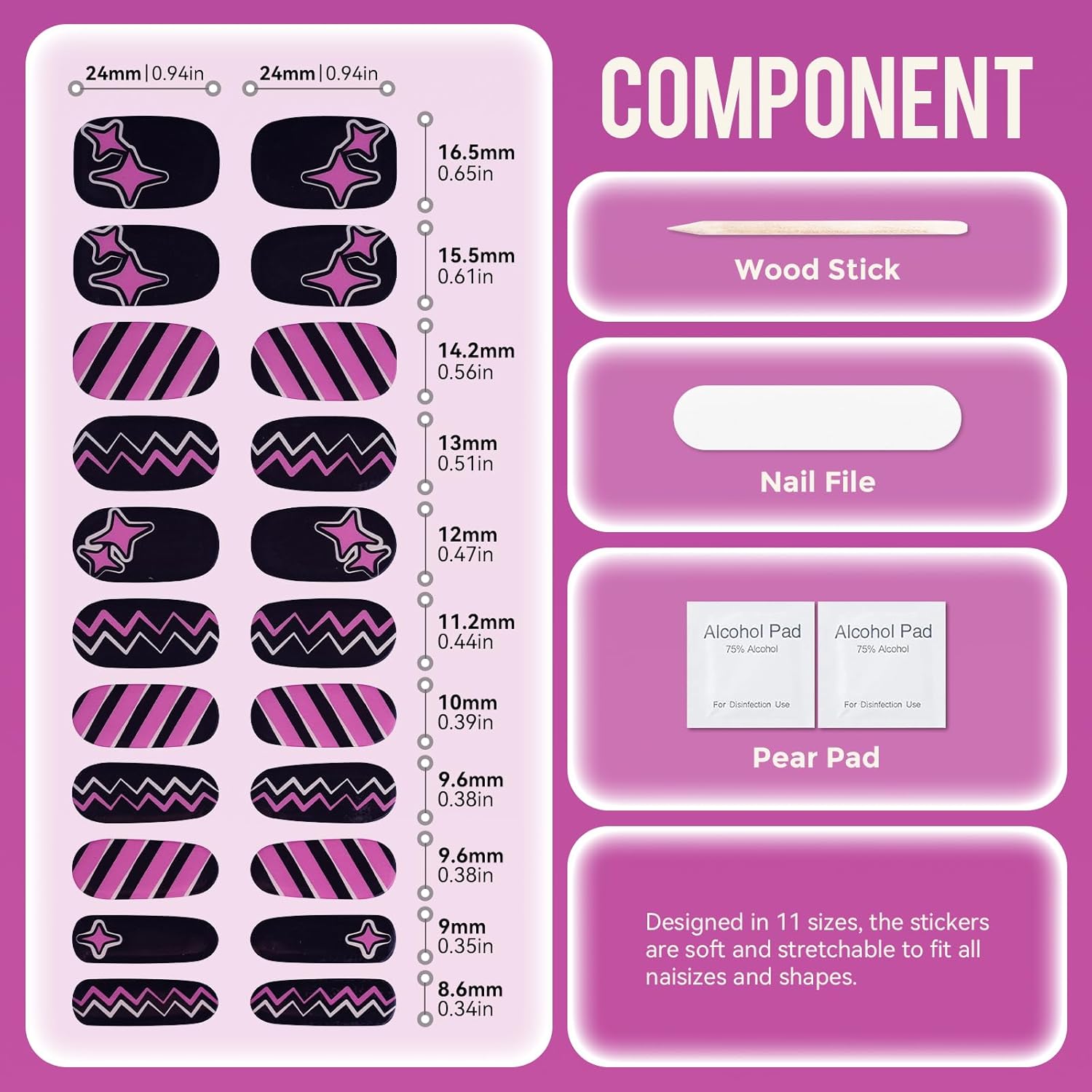 - ăGel Nail Sticker SetăThis no-bake gel nail sticker set includes 22 pcs of gel nail stickers in 11 distinct sizes, along with 2 preparation pads,a nail file,and a wooden stick