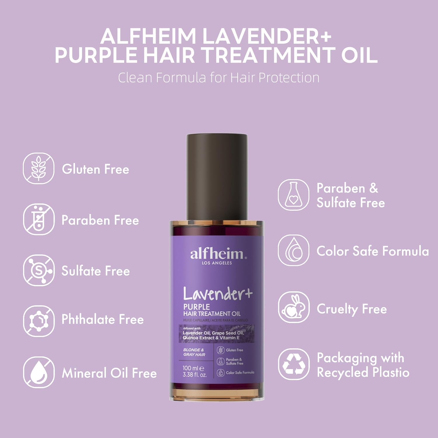 ALFHEIM Lavender+ Purple Hair Treatment Oil | Anti-Brass Toning & Shine Boosting Hair Oil for Blonde, Silver & Gray Hair | Heat Protection & UV Defense | Sulfate-Free, Paraben-Free | 3.38 fl.oz