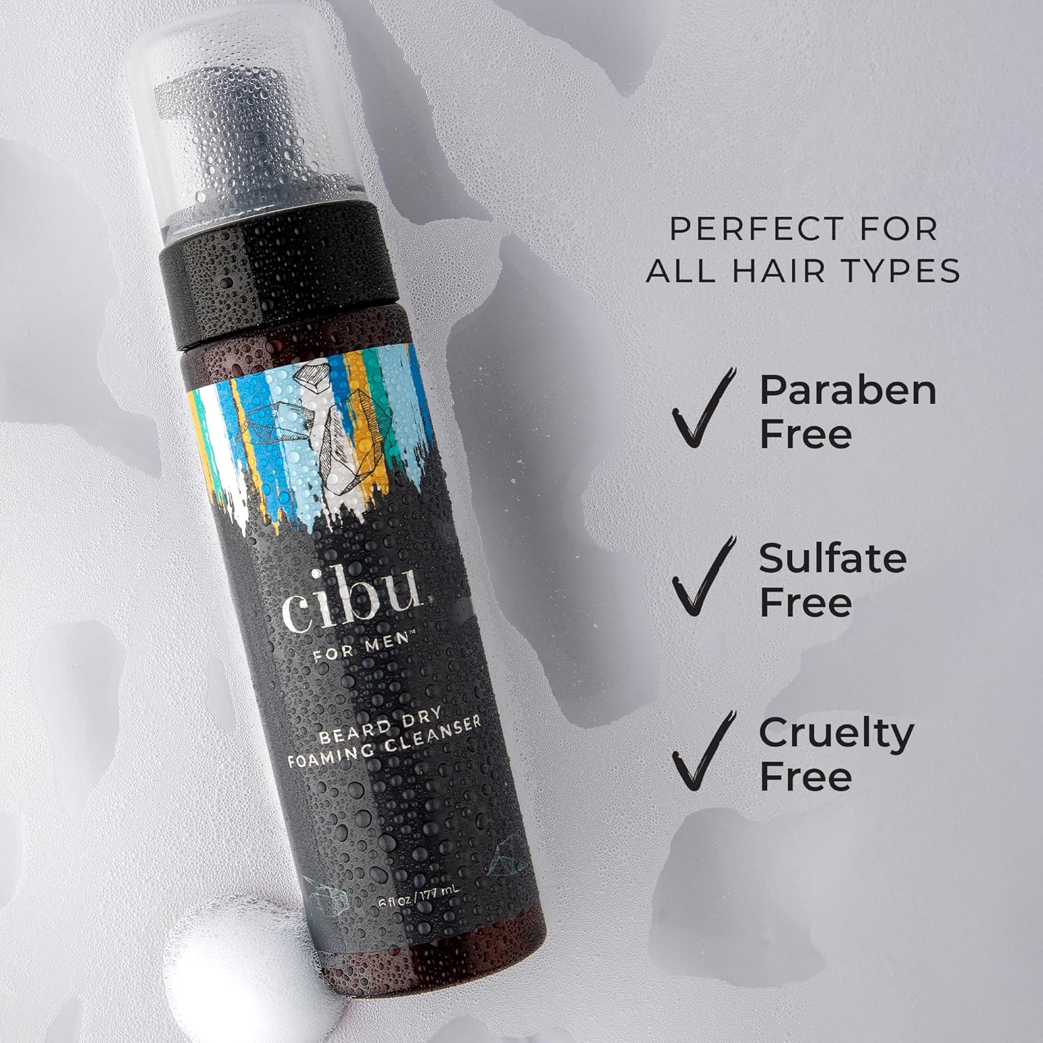 Cibu for Men Beard Dry Foaming Cleanser 6oz - Rinse-Free Beard Wash for Men to Control and Tame Unruly Beards and Coarse Hair - Softening and Nourishing Beard Cleaner with Aloe, Jojoba, and Argan Oils