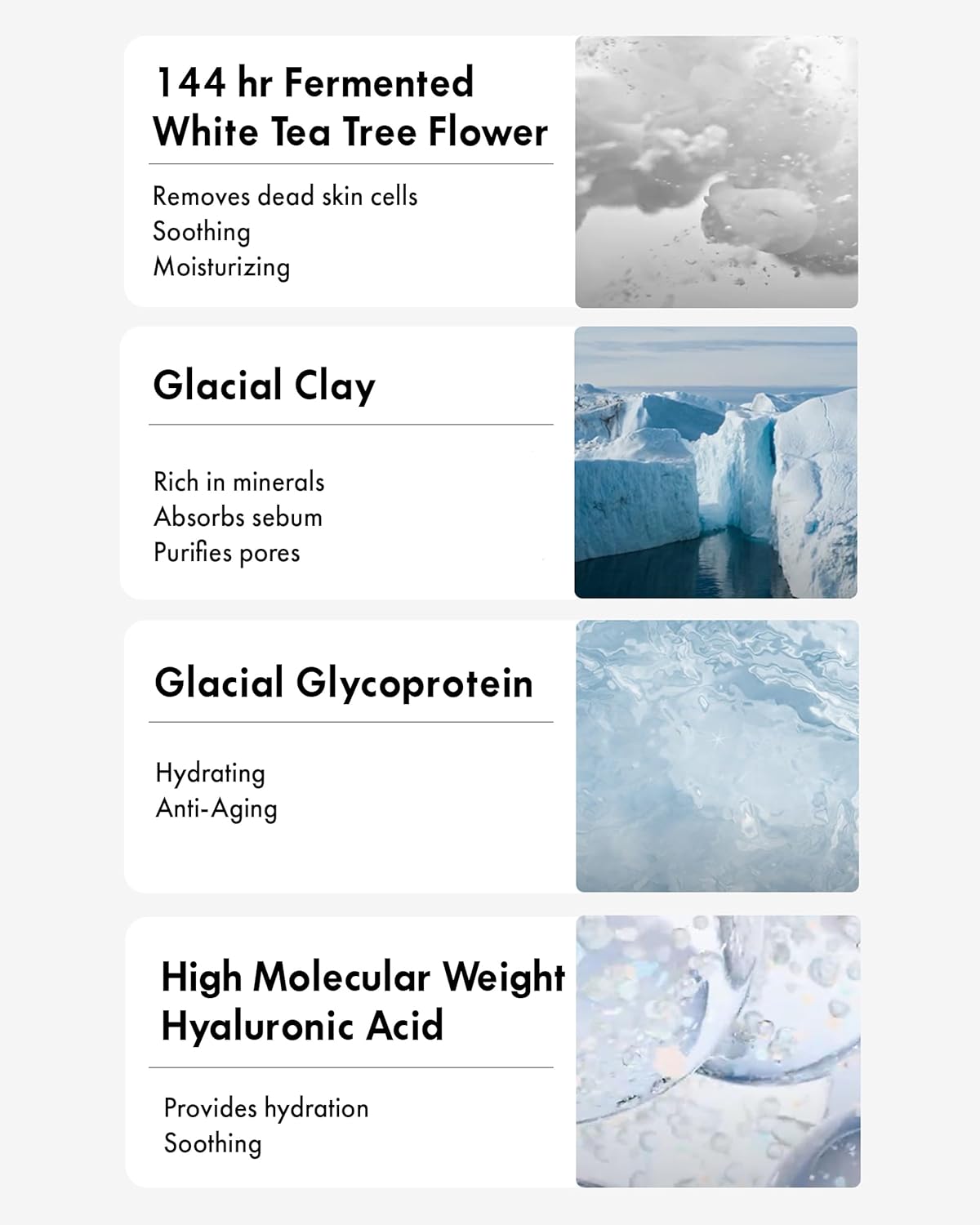 - RICH IN SKIN-SOOTHING INGREDIENTS: Formulated with sensitive skin in mind, this mask includes key ingredients like fermented white tea tree flower, glacier soil, Antarctic microbial glacier sugar protein, and polymer hyaluronic acid, which work together to moisturize and soothe the skin effectively.