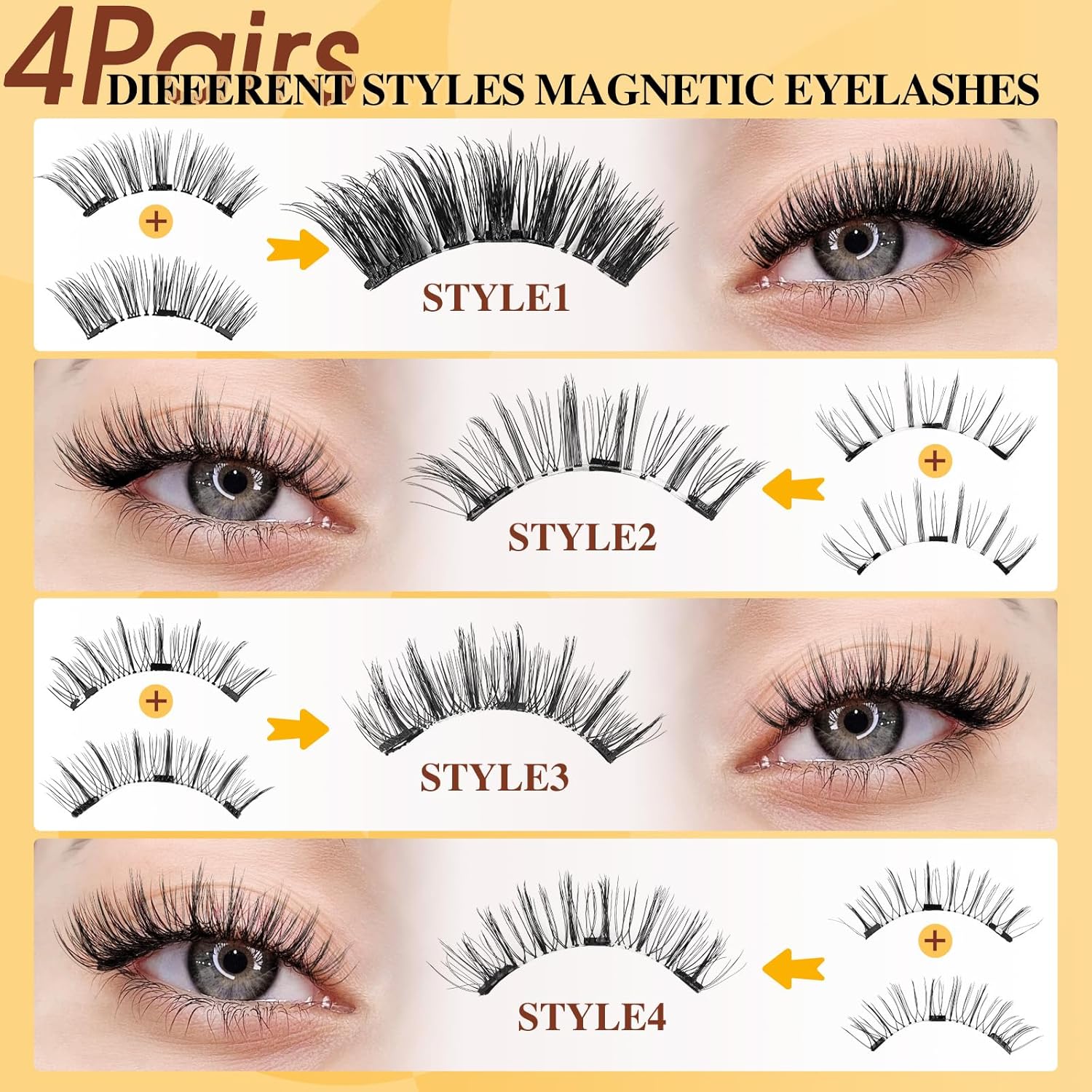 • Magnetic Eyelashes Kit: The magnetic lashes kit includes 4 pair of magnetic eyelashes, 2 magnetic applicator, 2 small magnetic box with a mirror, and one instruction sheet. Magnetic lashes are easy to operate and only take 2 minute to complete, effectively saving your makeup time and allowing you to stay on through an entire sweaty rave!