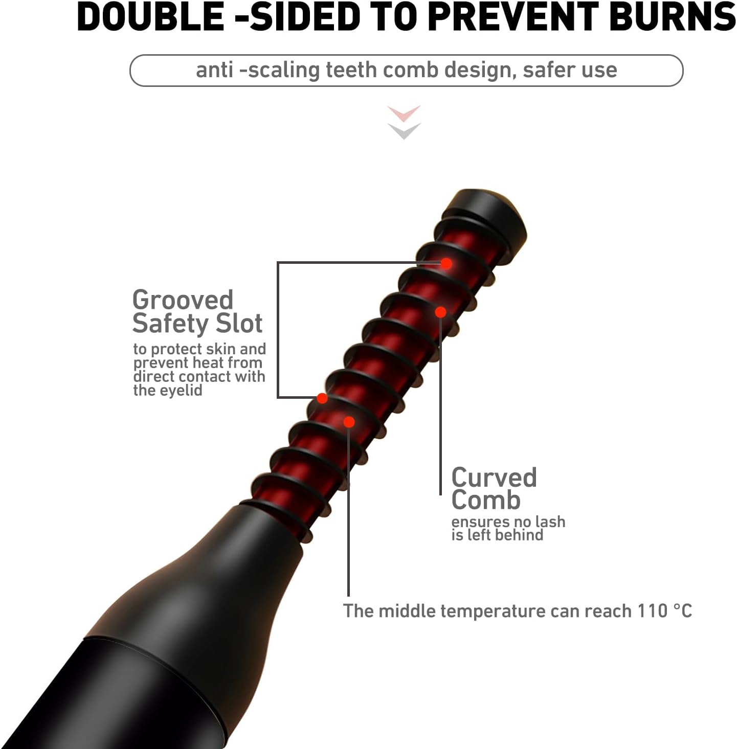 - 【SUPER EASY TO USE&BEGINNER-FRIENDLY】The heated eyelash curler thermal protection slot extends the distance between Ceramic heating element and the eyelid,ensures safe,gentle use.avoiding damage to the skin or high-temperature contact with the eyelid,helping you to create long-lasting and delicate eyelash makeup safely and quickly.making it easy for both beginners and experts to achieve flawless,long-lasting lash curl