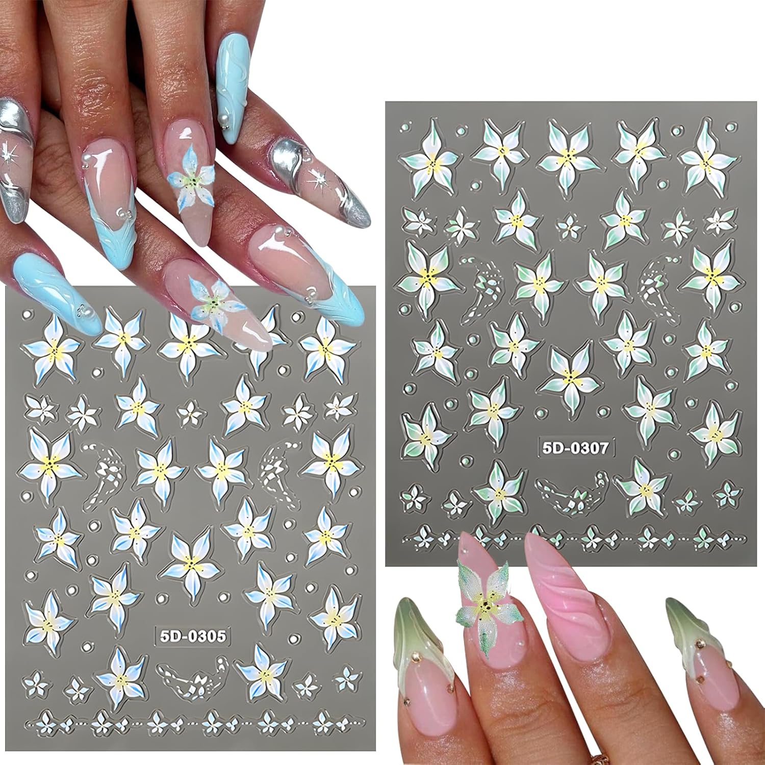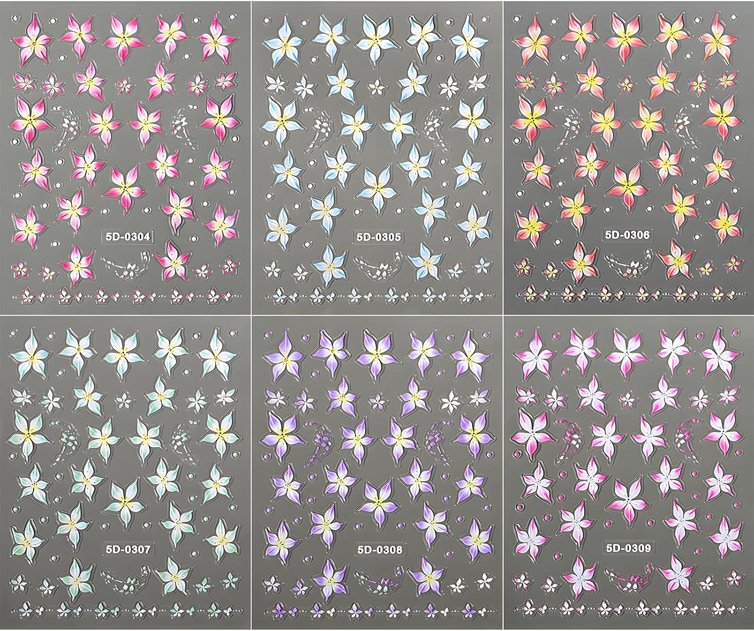 - ăExquisite designăOur nail stickers are designed with lily flower patterns. There are six colors to choose from, including green, blue, pink, purple, orange, and red, allowing you to create salon-quality manicures at home.