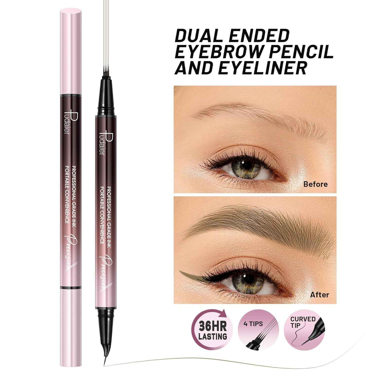 - Multi-function Eye Brow Pen and Eyeliner: The curved brush head can be used not only to define fine eyebrows, but also for eyeliner and lower lashes. The 4-fork tip can also be used to define the hairline;