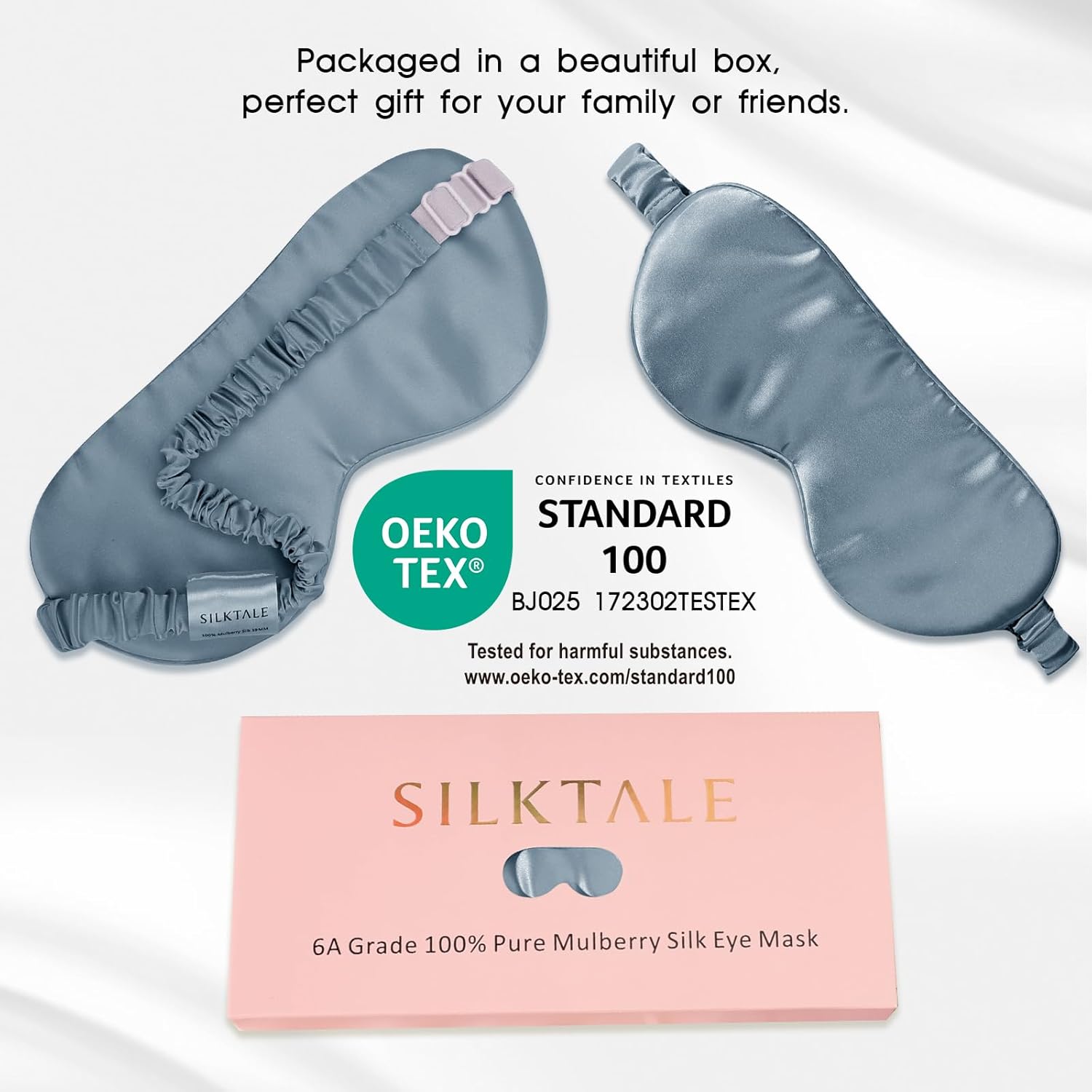 - SILKTALE sleep eye mask is made of 100% Grade 6A 19 momme Pure Mulberry Silk. Our silk is granted the OEKO-TEX STANDARD 100 certification, which is certified to be free of chemicals and colored with environmentally-safe dyes.