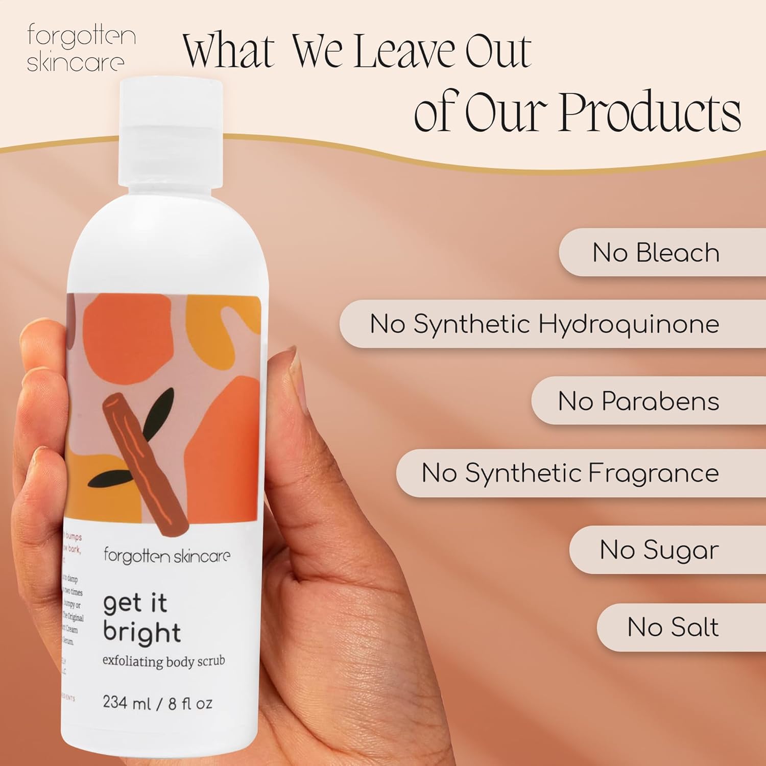 - Brightens Dark Areas & Smooths Texture Formulated with glycolic acid, pumice, and kaolin clay, this exfoliating body scrub targets dark underarms, bikini area, and bumpy skin to reveal a smoother, more even-toned complexion.