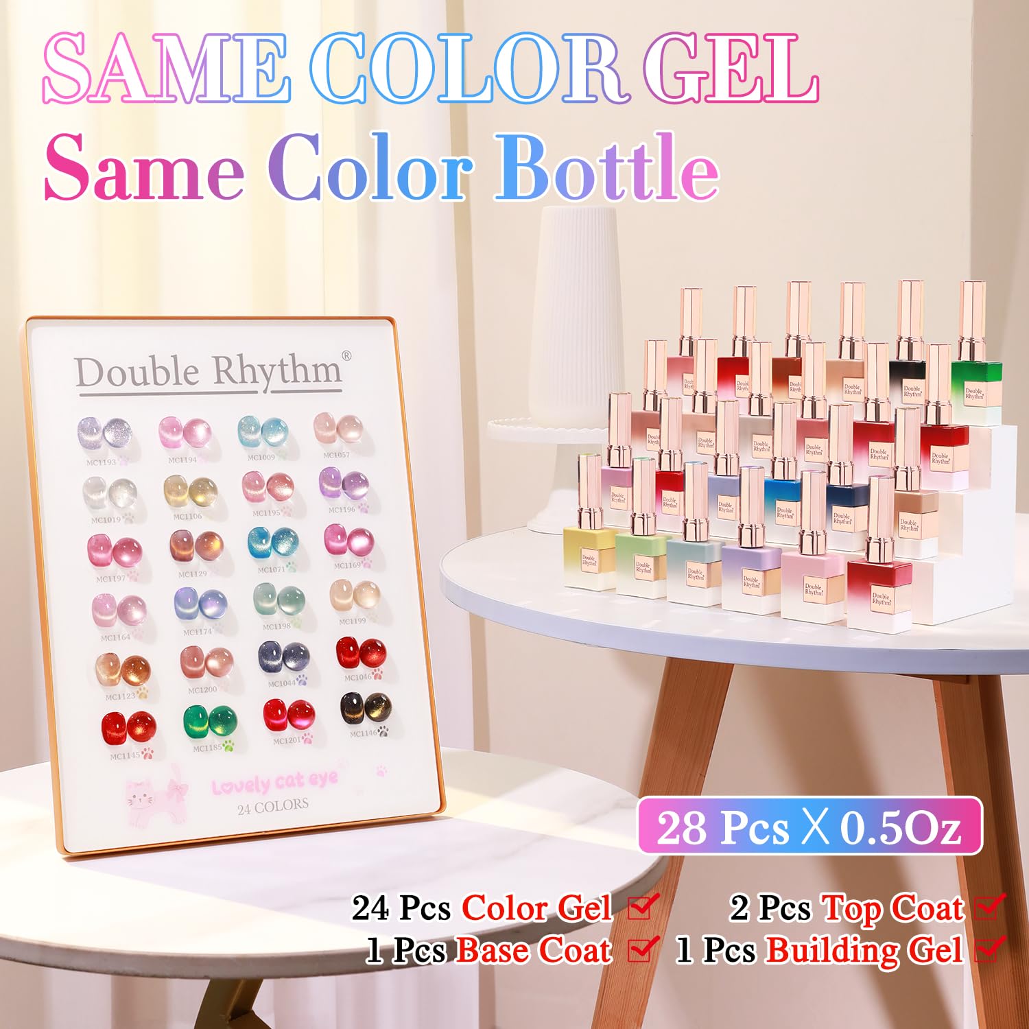 - 28Pcs Same Color Same Bottle Gel Polish: 24pcs 15ml gel polish for all season,2 pcs clear top gel and 1 pcs gel base gel and 1 pcs building gel, need to be cured under UV or LED Lamp for 60-120s. . Please shake the bottle or warm it with hot water before use, to acheive a better effect.
