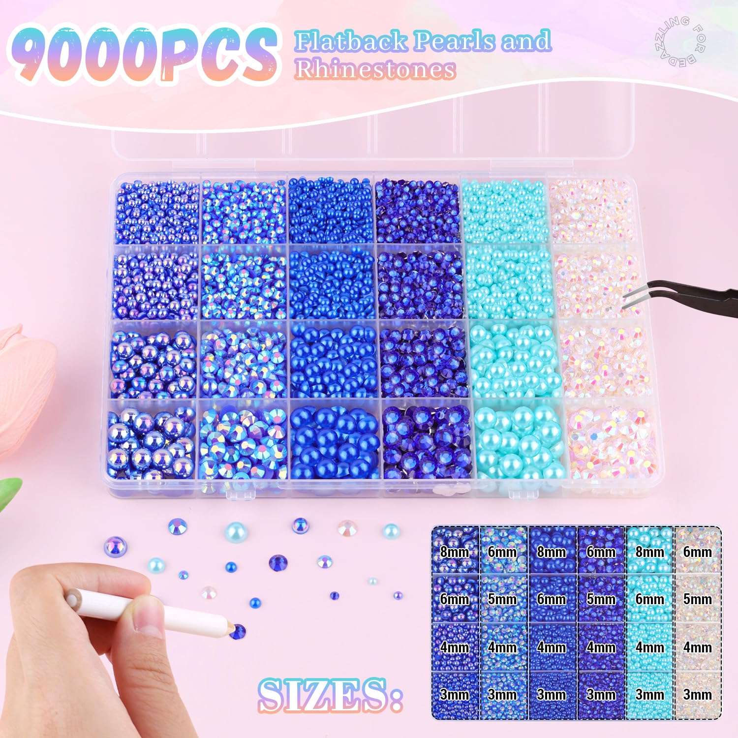 - WHAT YOU WILL RECEIVE:1 box of 9000pcs flat pearls and rhinestones to meet your different needs. Besides, this set of half pearls and gems also with a tweezers and a picker pencil, which help you spare no effort to pick up the beads.