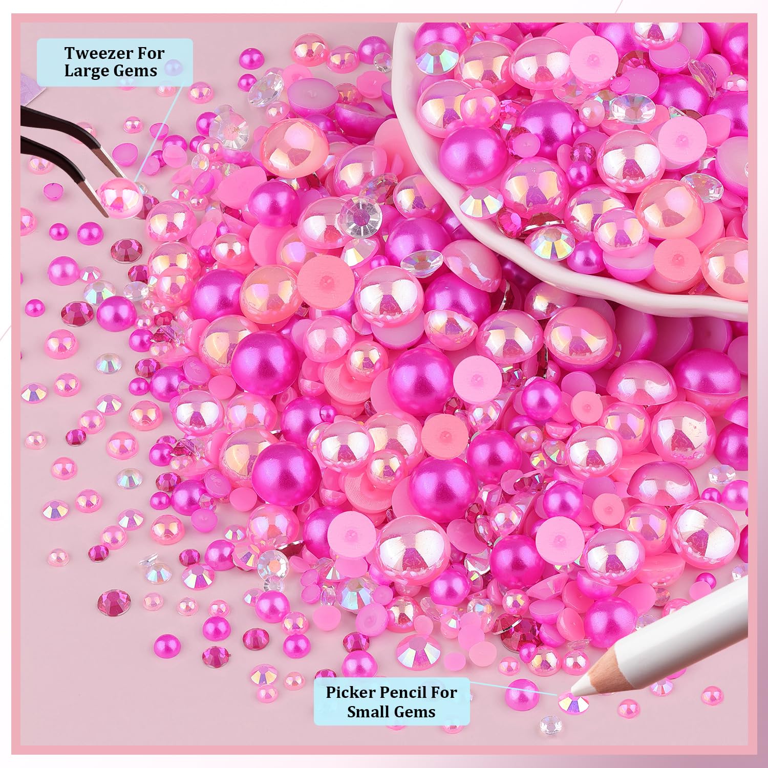 - WHAT YOU WILL RECEIVE:1 box of 9000pcs flat pearls and rhinestones to meet your different needs. Besides, this set of half pearls and gems also with a tweezers and a picker pencil, which help you spare no effort to pick up the beads.