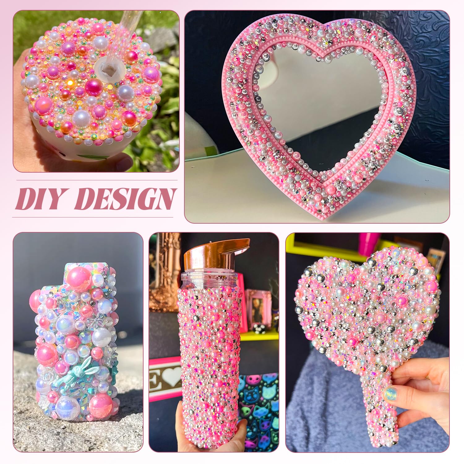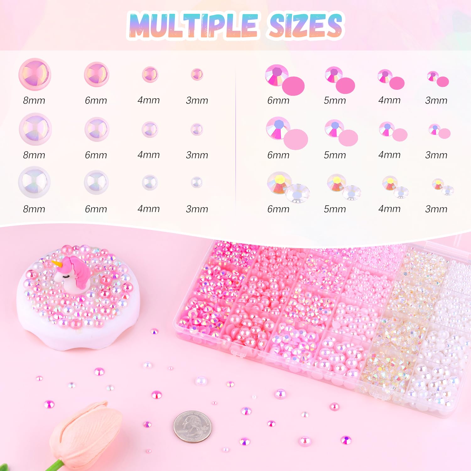 9000Pcs Flatback Pearls and Rhinestones for Crafting, Pink White Mixed Size 3-8mm Resin Rhinestones and Half Pearls for Bedazzling, Nail Art and Decoration with 3pcs B7000 Jewelry Glue