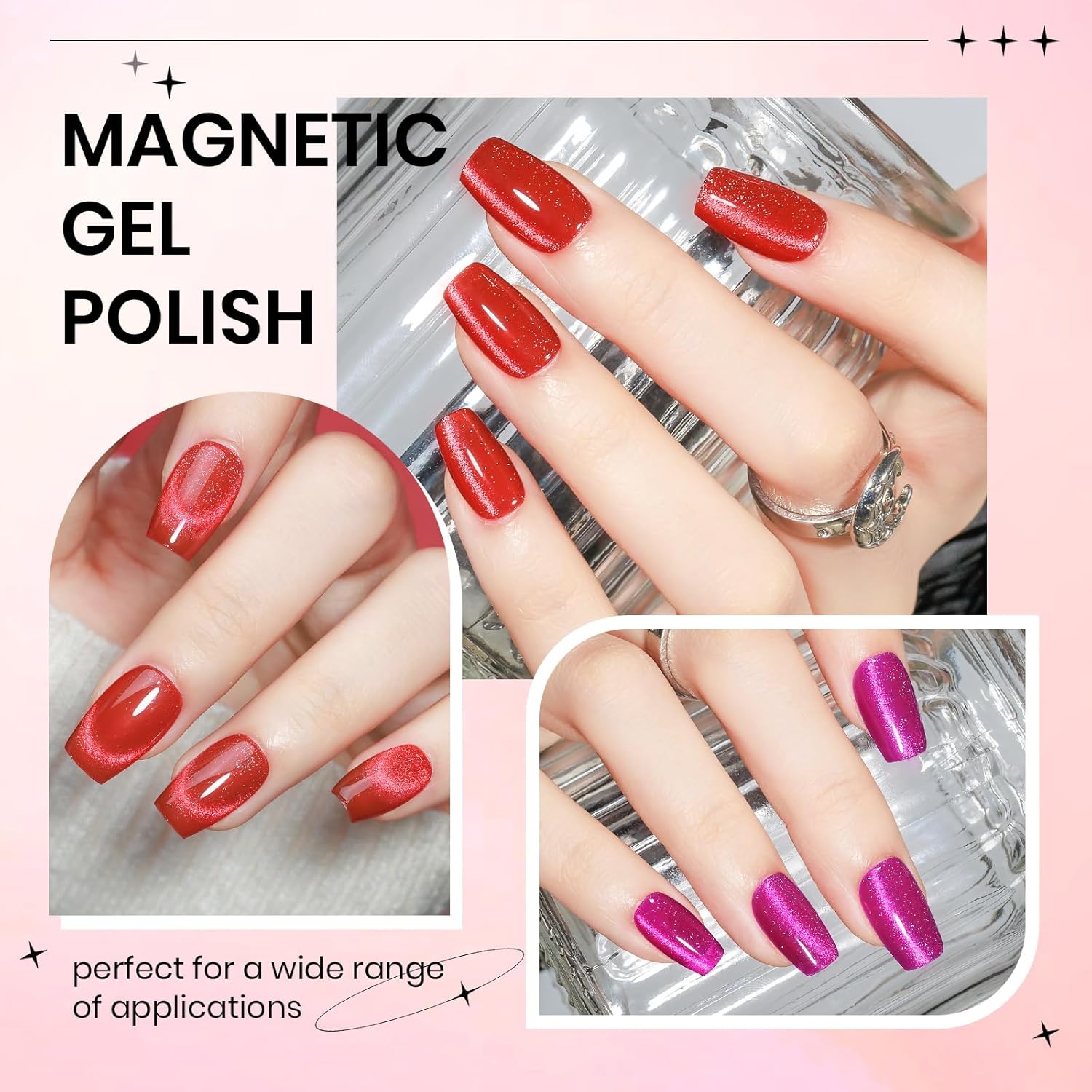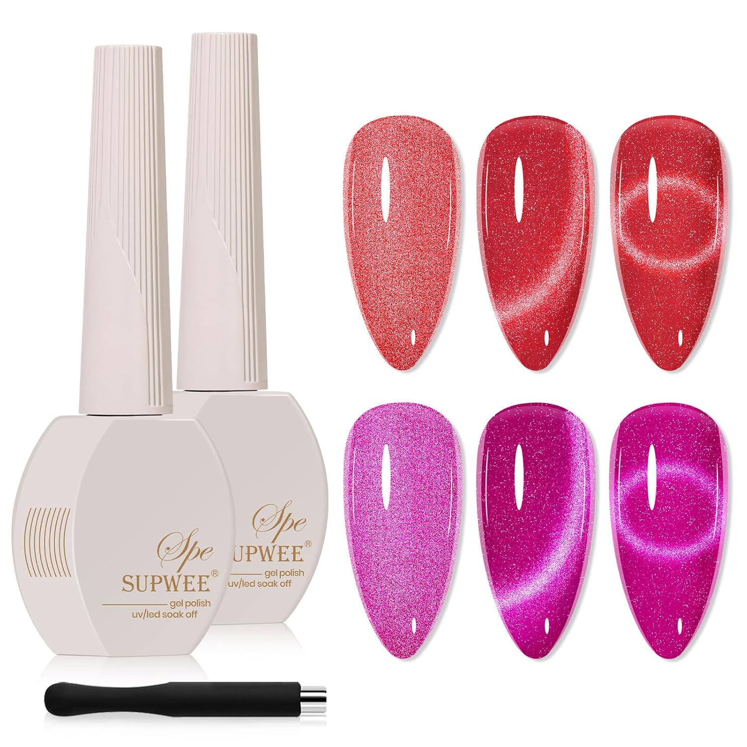 - 2PCS Cat Eye Gel Polish: 2*15ml(0.5fl oz) red and hot pink cat eye gel nail polish with 1PC magnetic stick. Mixed with smoothie magnetic glitter, it's perfect for making a statement