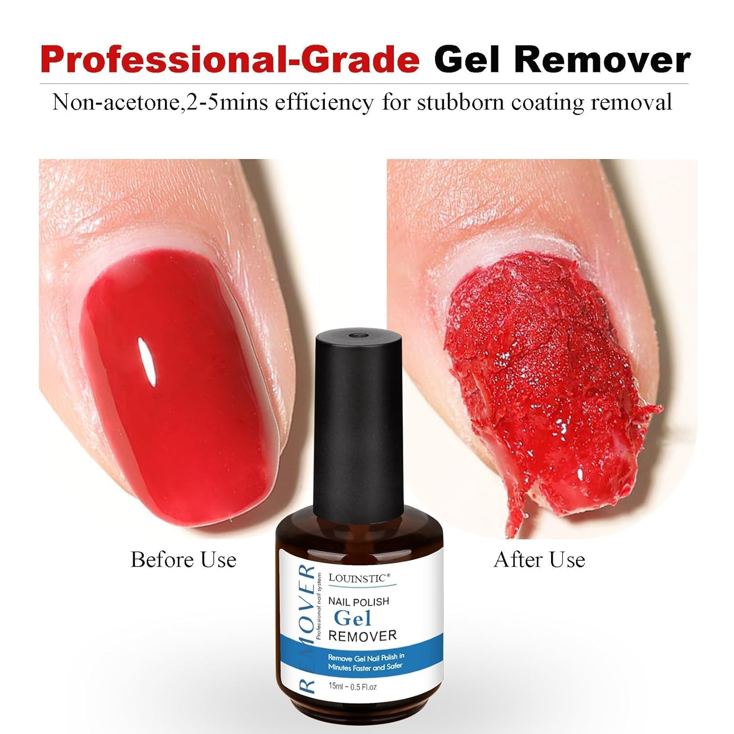 - -【Fast & Effortless Gel Removal】- LOUINSTIC’s 45 ml gel nail remover effortlessly dissolves gel, shellac nail polish remover formulas in just 2–5 minutes—no soaking, no foil, no mess.