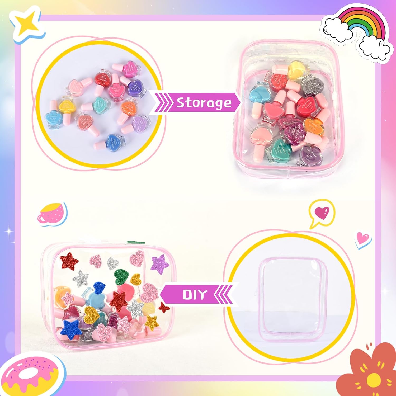 - Complete Kids Nail Polish Set: This deluxe kids nail polish set for girls includes 12 vibrant colors in adorable 5ml mini nail polish heart-shaped bottles, plus a precision nail art brush, fun DIY stickers, and a transparent PVC storage bag. The durable bag keeps everything organized and mess-free, preventing lost bottles.