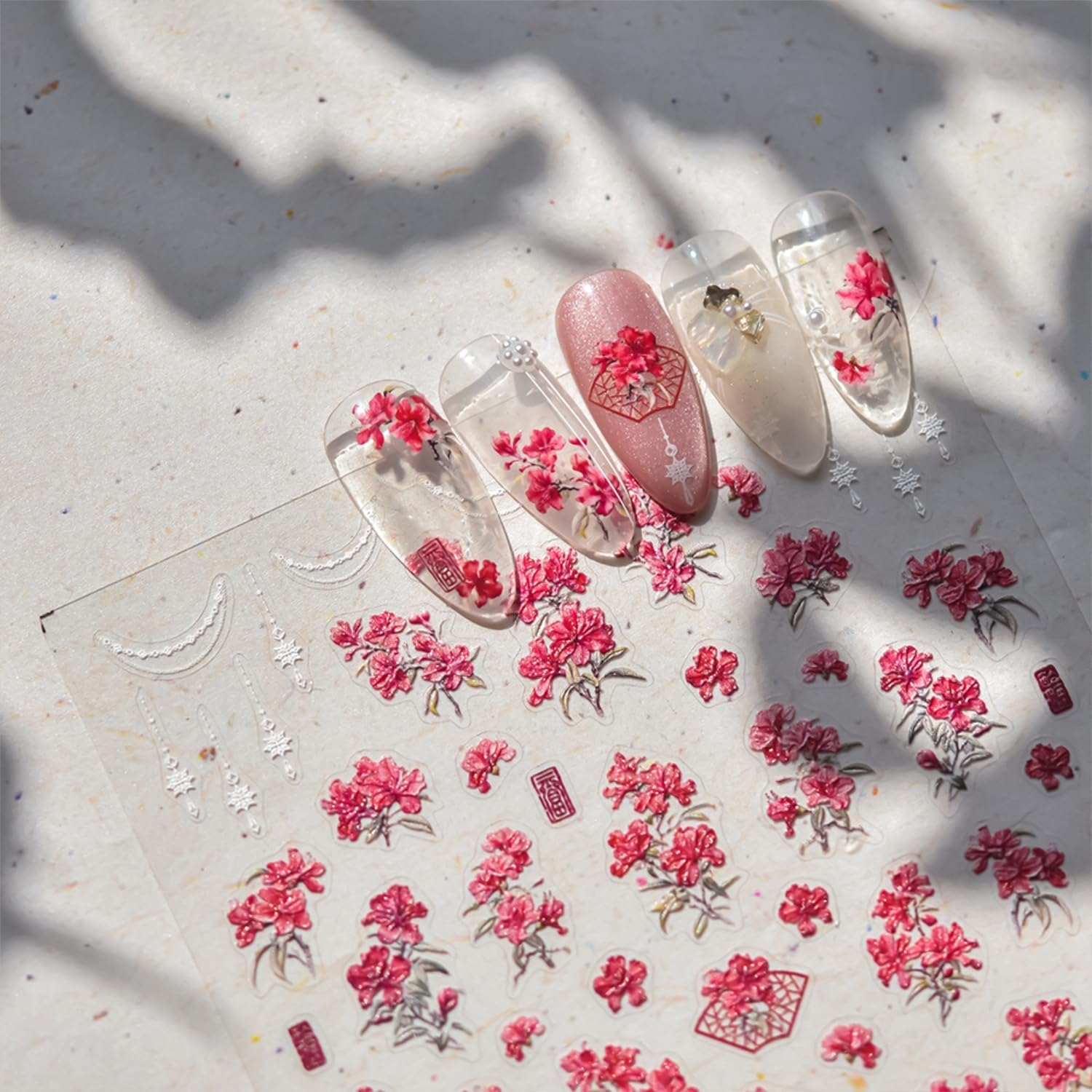Spring Summer Nail Art Stickers 5D Self Adhesive Nail Decals Red Flower Nail Stickers for Nail Art Embossed Nails Design Floral Nails Supplies for DIY Manicure Decoration for Women Girls