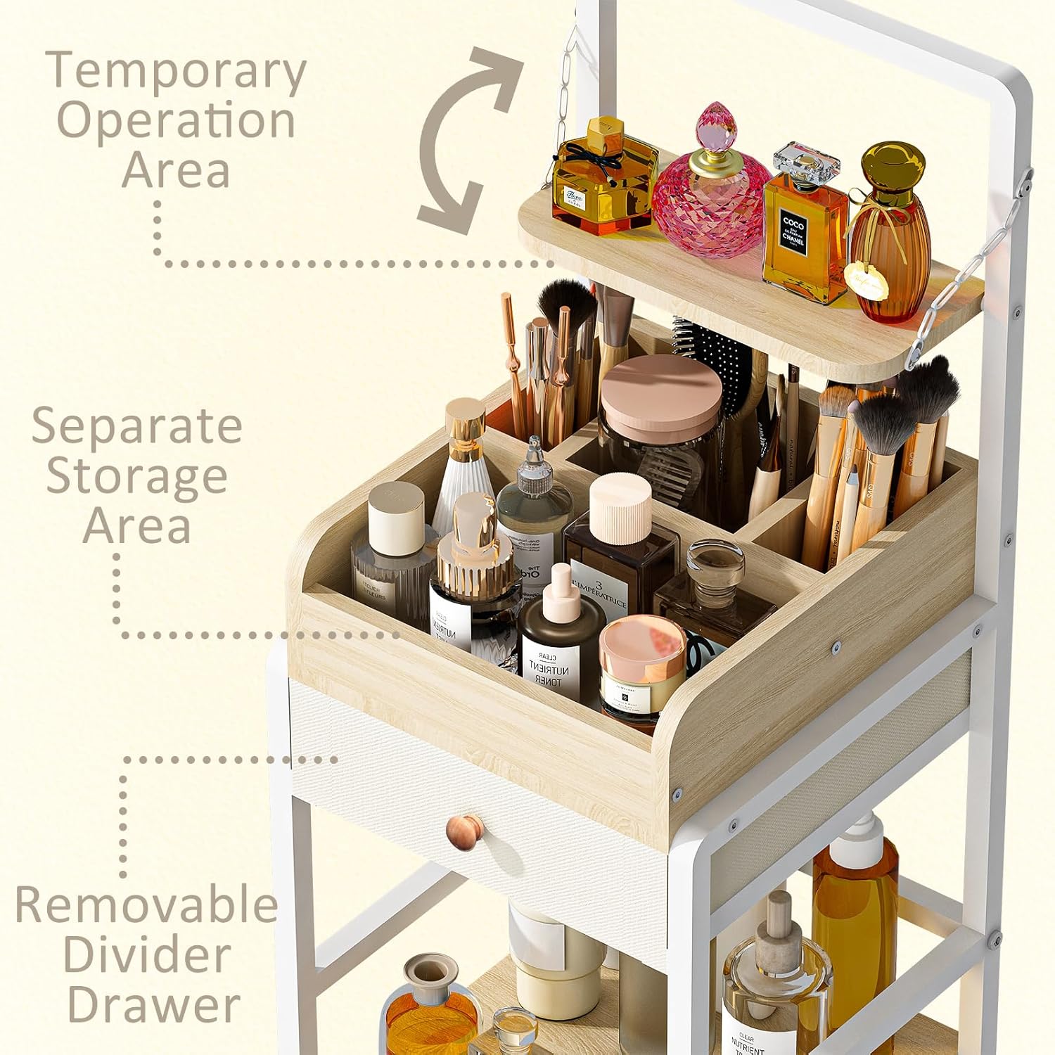 - Multi-Functional Makeup Organizer on Wheels – Rolling Makeup Storage Cart for Modern Women - This large-capacity makeup organizer doubles as a mobile vanity. The top section keeps daily essentials within easy reach, while spacious tiers below store all your beauty tools and skincare products.