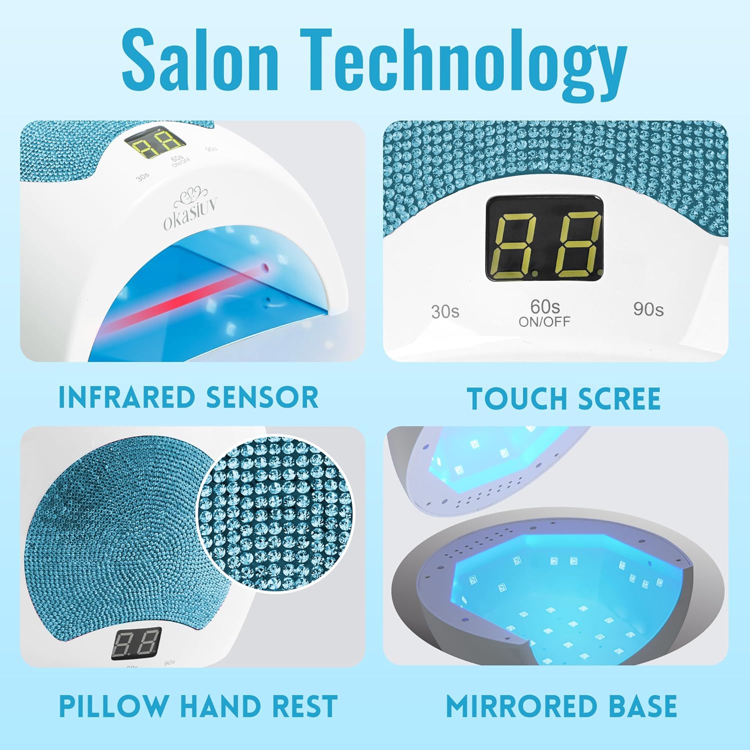- 【Fits ALL Gel Polishes & Extensions】Okasiuv works with hard gel, polygel, dip powder, acrylics, and more. Say goodbye to undercured nails—this lamp delivers salon-perfect results every time
