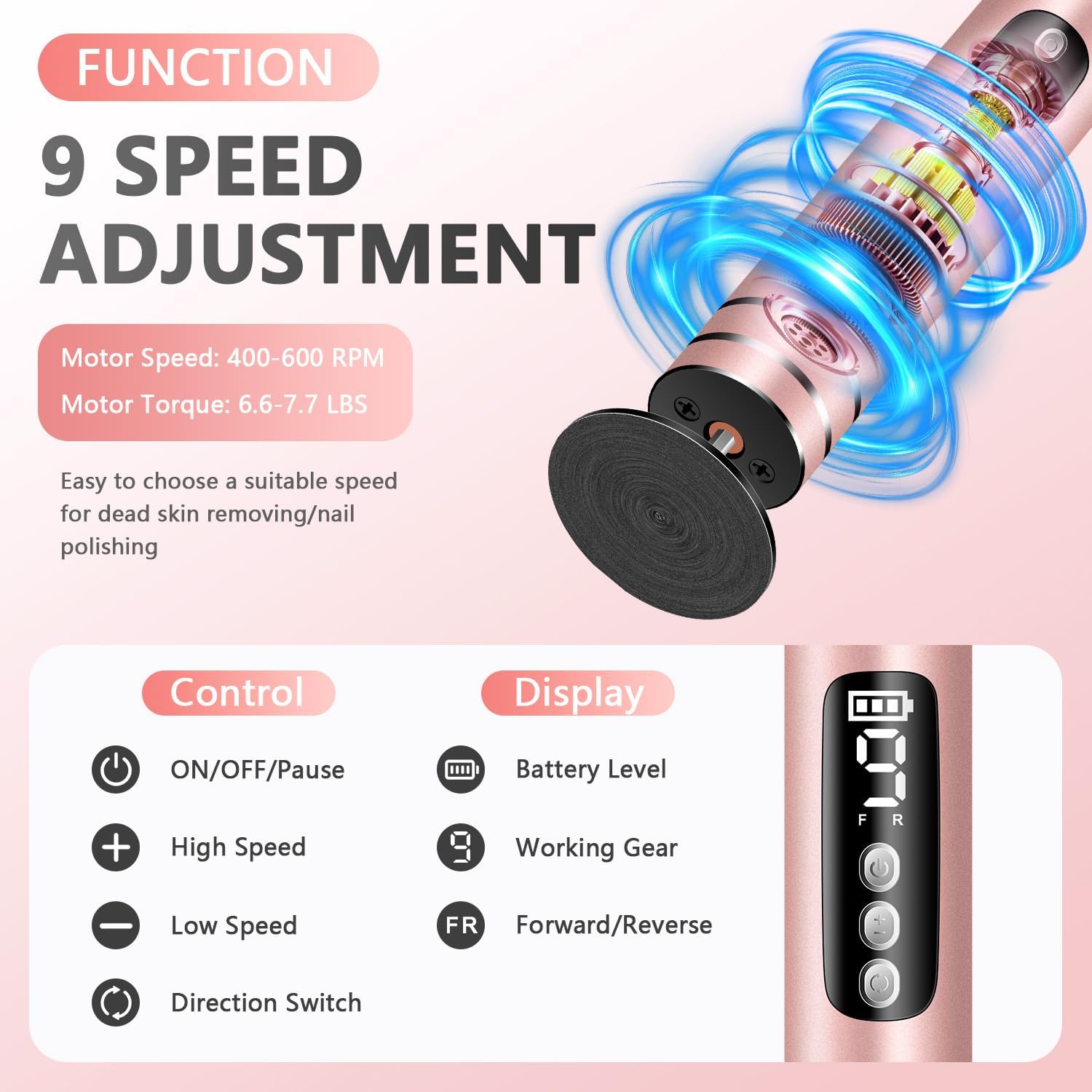 - ✅ 9 Adjustable Speeds (400-600 RPM) – There are 9 optional gears customize intensity from gentle to professional-grade, suitable for beginners & pros. Deep & Gentle Exfoliation, High-speed rotating heads effortlessly remove hard skin & calluses without irritation, leaving feet soft & smooth
