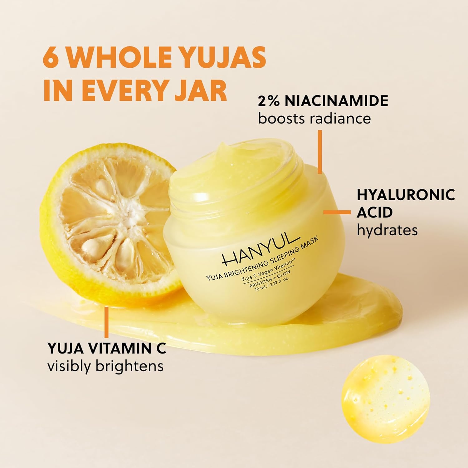 - 6 WHOLE KOREAN YUJAS IN EVERY JAR β Formulated with the peel, flesh, and seeds of six whole Korean Yuja (Yuzu) fruits sourced from Goheung, Korea, this antioxidant-packed sleeping mask revitalizes tired, dull skin for a visibly refreshed morning glow.