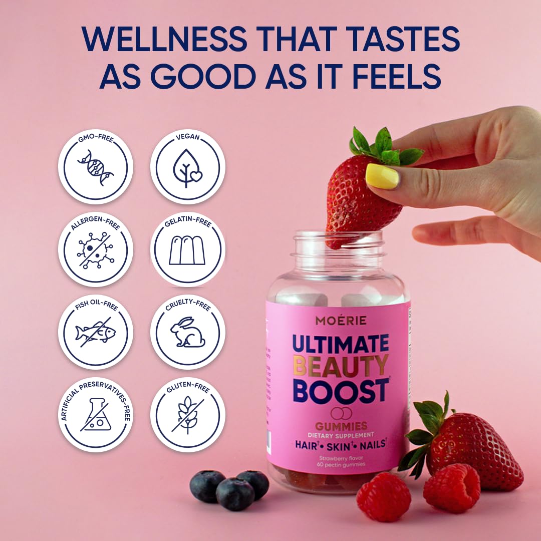 - Wellness That Tastes as Good as It Feels! Upgrade Your Routine With Something Youβll Actually Enjoy β A Sweet Strawberry Biotin Gummies That Makes Beauty Support Fun Again. Packed With High-Potency Biotin, Vitamins C & E, and Clean Ingredients You Can Trust. Moerie Hair Nails and Skin Vitamins for Women and Men β Support Radiant Hair, Glowing Skin, and Strong Nails in the Most Delicious Way.
