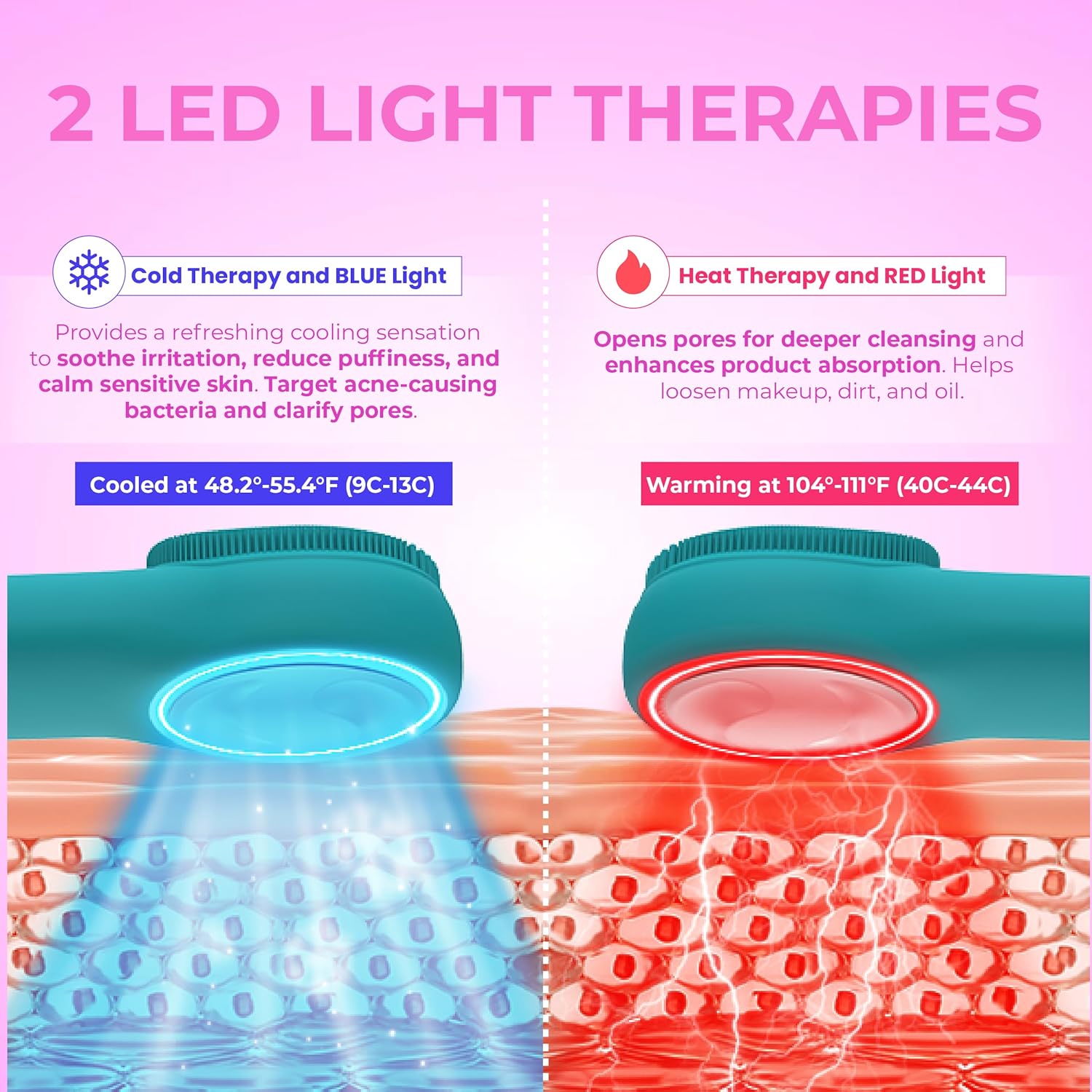 • Dual-Sided Design for 2-in-1 Skincare - Get the best of both worlds with the RIKI LOVES Silicone Facial scrubber. One side features fine, soft silicone bristles (in two sizes) for deep cleansing and gentle exfoliation. The other side delivers Heating, Cold Compress, and LED light therapy for a soothing spa experience—all in one stylish device.
