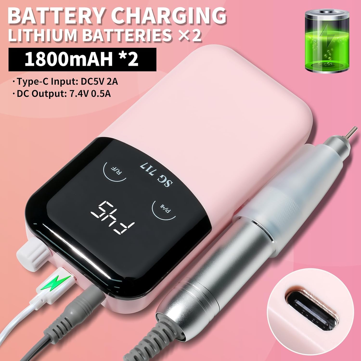 Professional Electric Nail Drill Machine,45000RPM Portable Rechargeable Efile Nail Drill Cordless,Electric Nail File Kit for Women (Pink)