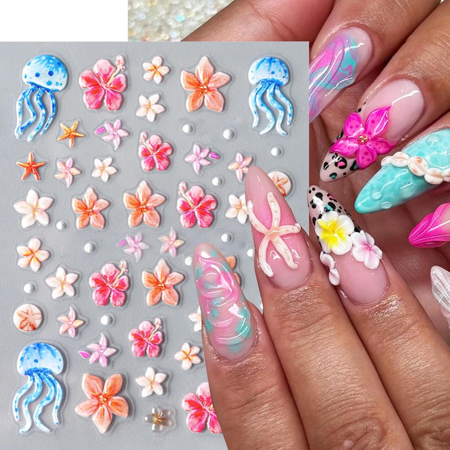 - Easy to Use: Ocean style marine life starfish flower nail art stickers is self-adhesive and requires no glue, just remove sticker then stick this 3d nail stickers on your nail. Apply top coat gel to seal to make the stickers last longer.