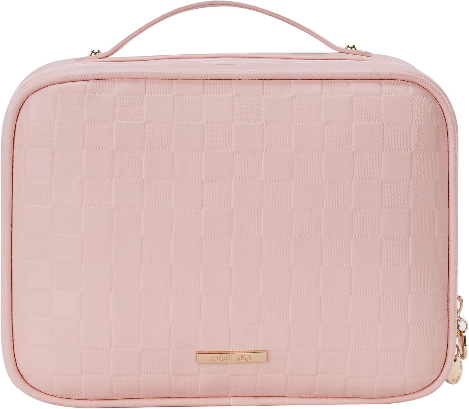 RIGHT AWAY Travel Toiletry Bag for Women, Waterproof Makeup Bag&Case, Portable Cosmetic Organizer Checkered Make up Bag for Full Sized Toiletries,Cosmetics and Travel-Size Accessories,Pink Checkered