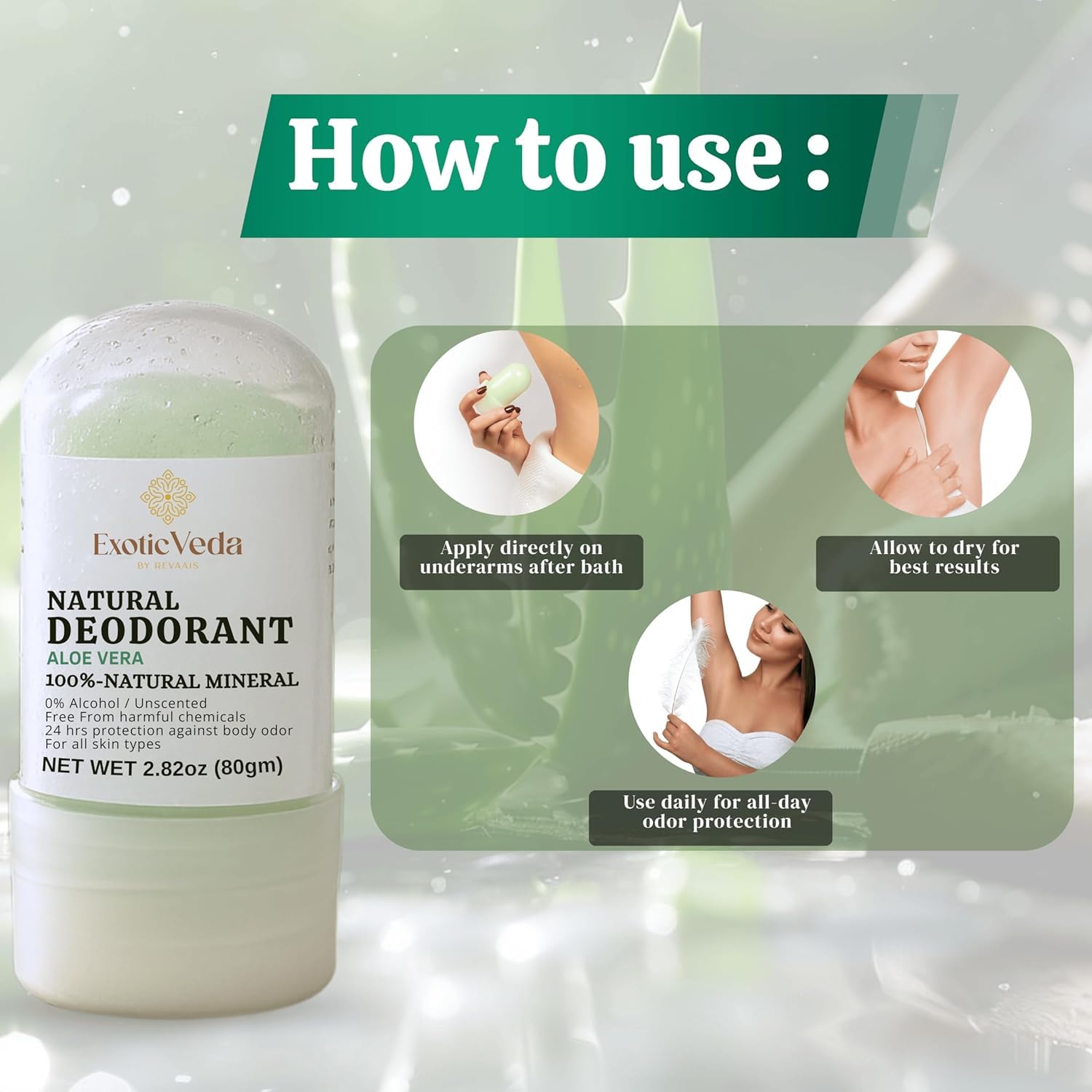 - Eco-Friendly, Vegan & Cruelty-Free Choice β Exotic Veda Alum Aloe Vera Deodorant Stick is designed for eco-conscious living. Made from natural mineral alum and soothing aloe vera, it is vegan, cruelty-free, and free from synthetic chemicals, making it a safe, gentle, and effective choice for all skin types. This natural deodorant provides reliable odor protection while caring for your skin and the planet. A perfect alternative to conventional deodorants, it supports a clean, sustainable, and healthier lifestyle every day.