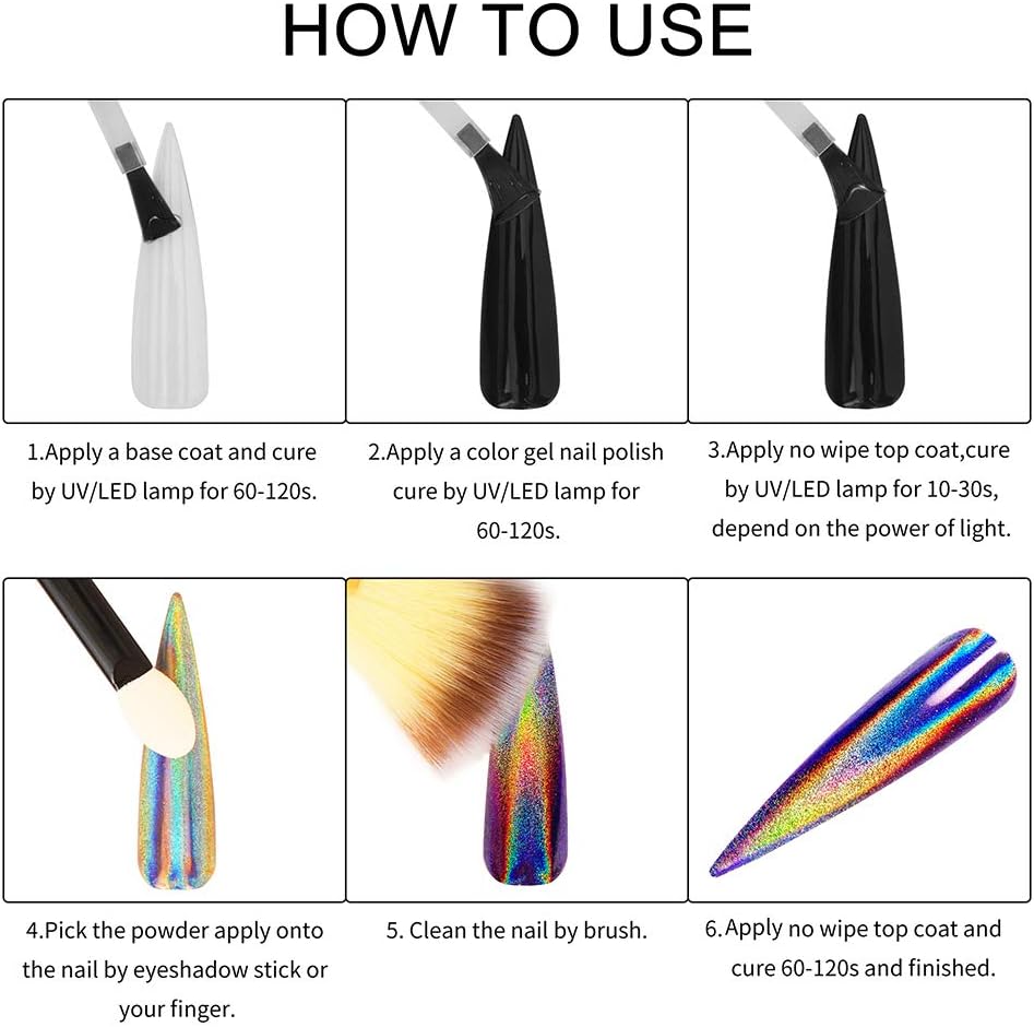 - PACKAGE CONTENTS: 3 jars different size holo powder, It needs to be used with gel nail polish and no wipe top coat. They can make many different design for your gel nail polish. It gives different color base a pearly shine for your nails