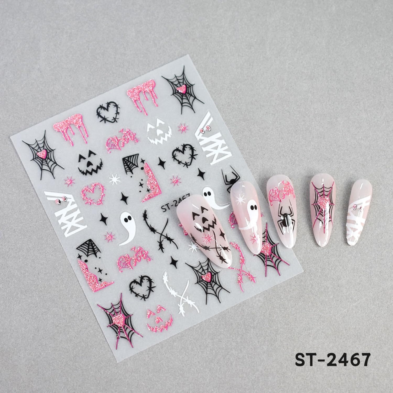 6 Sheets Halloween Nail Stickers Decals Pink Glitter Pumpkin Blood Drop Nail Sticker Black Spider Web Bat Nails Decals Self-Adhesive White Ghost Skull Nails Art Sticker Decal for Women Halloween Decor